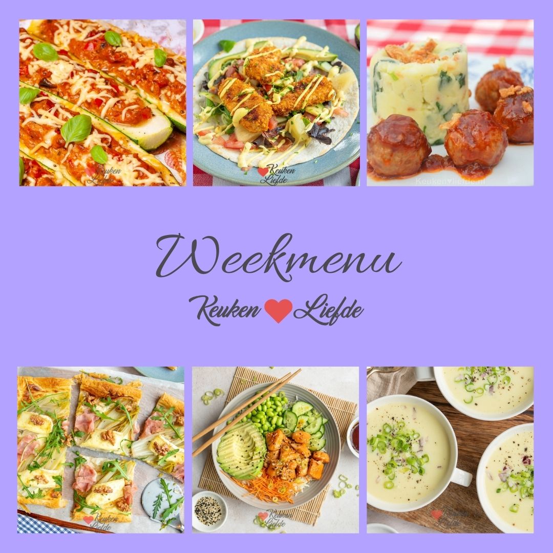 Een weekmenu is een handige en leuke manier om alvast te bedenken wat je de hele week gaat eten. Omdat er bij de meeste mensen vaak één dag in de week is waarop je niet kookt — omdat er bijvoorbeeld kliekjes zijn, of omdat je zin hebt in een frietje of iets anders — deel ik in dit weekmenu 7 hoofdgerechten. Op zondag is het bakdag en deel ik een lekker toetje of zoet baksel met je.