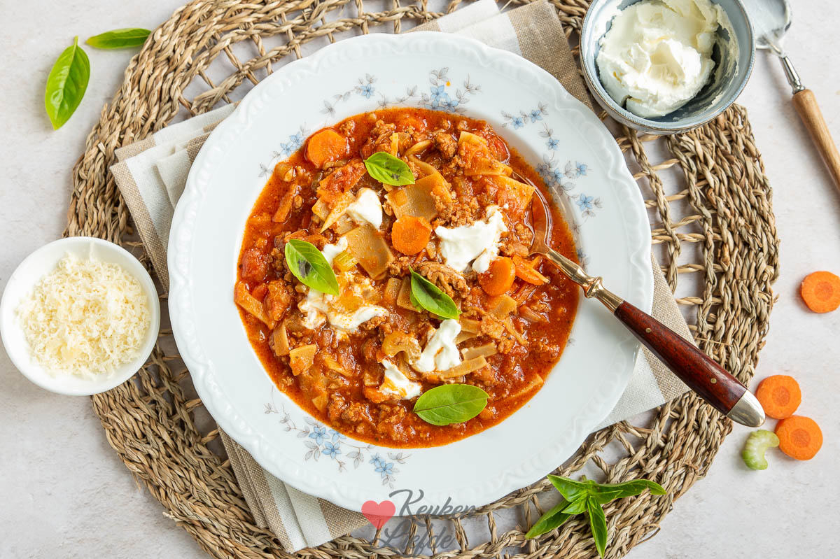 Deze lasagnesoep smaakt als lasagne maar is veel makkelijker te maken — een heerlijke kom comfort food waar je het hele gezin blij mee maakt.