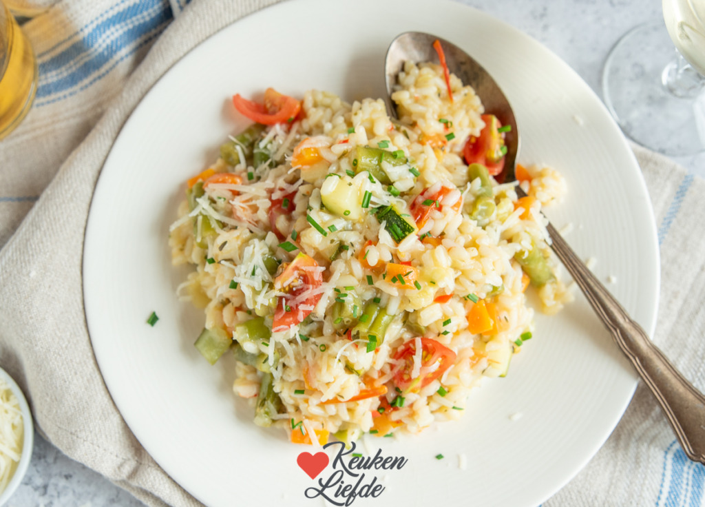 Risotto alle verdure is een smeuïge risotto bomvol groenten zoals wortel, courgette, sperzieboontjes en tomaatjes. Lekker als vegetarisch hoofdgerecht, maar ook met een stukje gebakken vis of kip.