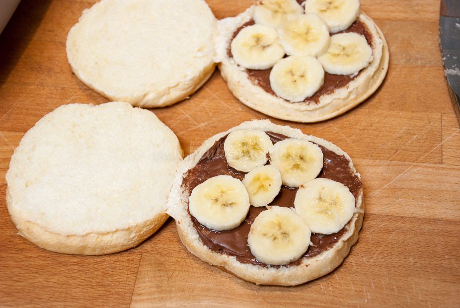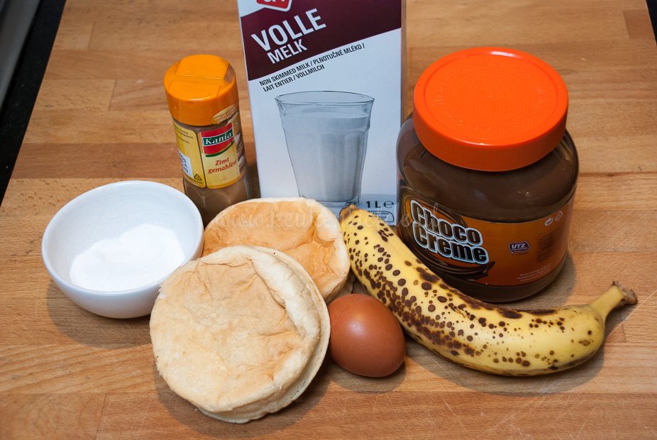 Snijd de beschuitbollen doormidden. Besmeer het brood met chocopasta en beleg met plakjes banaan. Verhit de koekenpan met boter. Klop het ei los met de melk, kaneelpoeder en suiker en wentel de beschuitbollen hier doorheen. Bak de beschuitbollen aan beide kanten goudbruin in de boter.