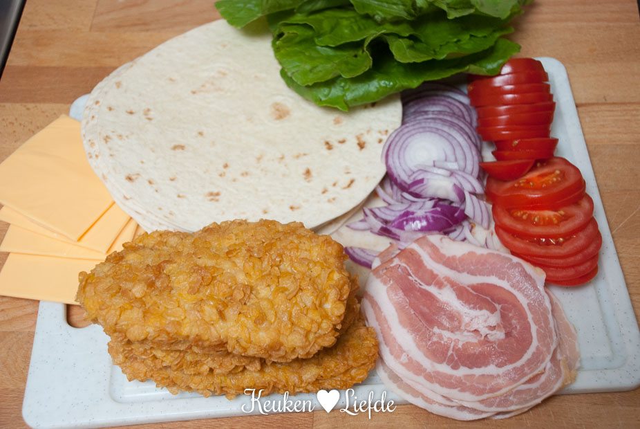Verhit een koekenpan met wat bakboter of olie en bak het ontbijtspek knapperig uit. Laat het spek op een stukje keukenpapier uitlekken. Veeg de koekenpan schoon en verhit opnieuw met wat boter of olie. Bak de kipschnitzels in de koekenpan goudbruin. Leg de laatste minuut van de baktijd op elke schnitzel een plakje cheddar en laat smelten. Leg de schnitzels op een snijdplank en snijd elke schnitzel over de lengte in circa zes smalle repen. Roer de ingrediënten voor de honing-mosterdsaus door elkaar. Beleg de tortillawraps met een blaadje sla, spek, tomaat, reepjes kipschnitzel, ui en druppel er wat van de honing-mosterdsaus overheen. Rol zo strak mogelijk op.