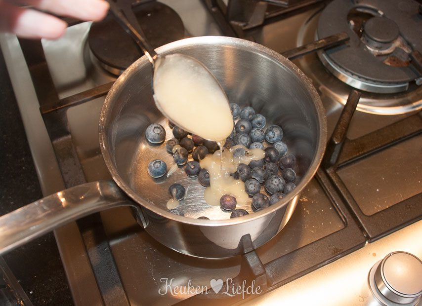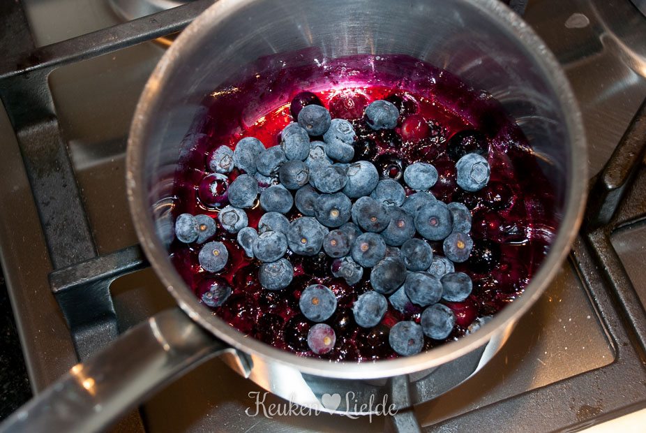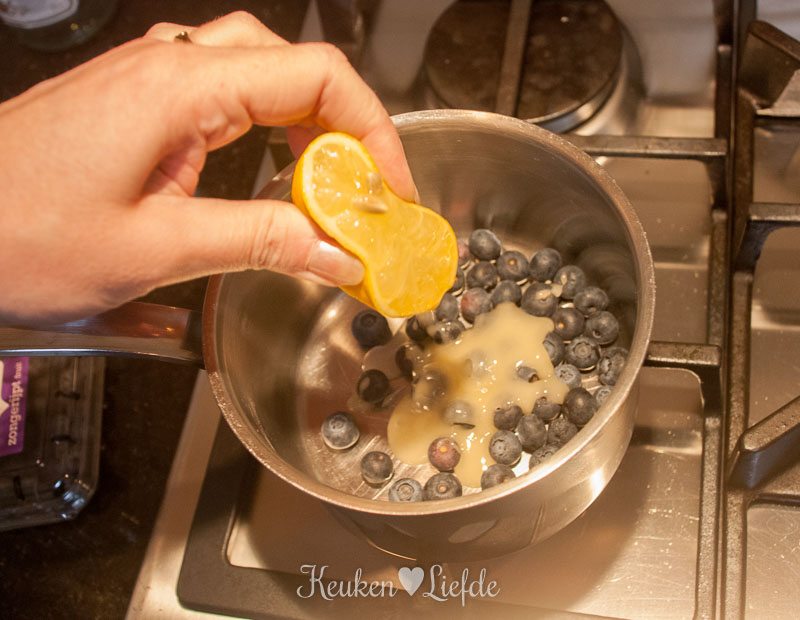 Doe de helft van de blauwe bessen in de steelpan en voeg de honing en het citroensap toe. Verwarm totdat de bessen openbarsten en voeg dan de overige bessen toe. Roer door elkaar en haal de pan van het vuur af.