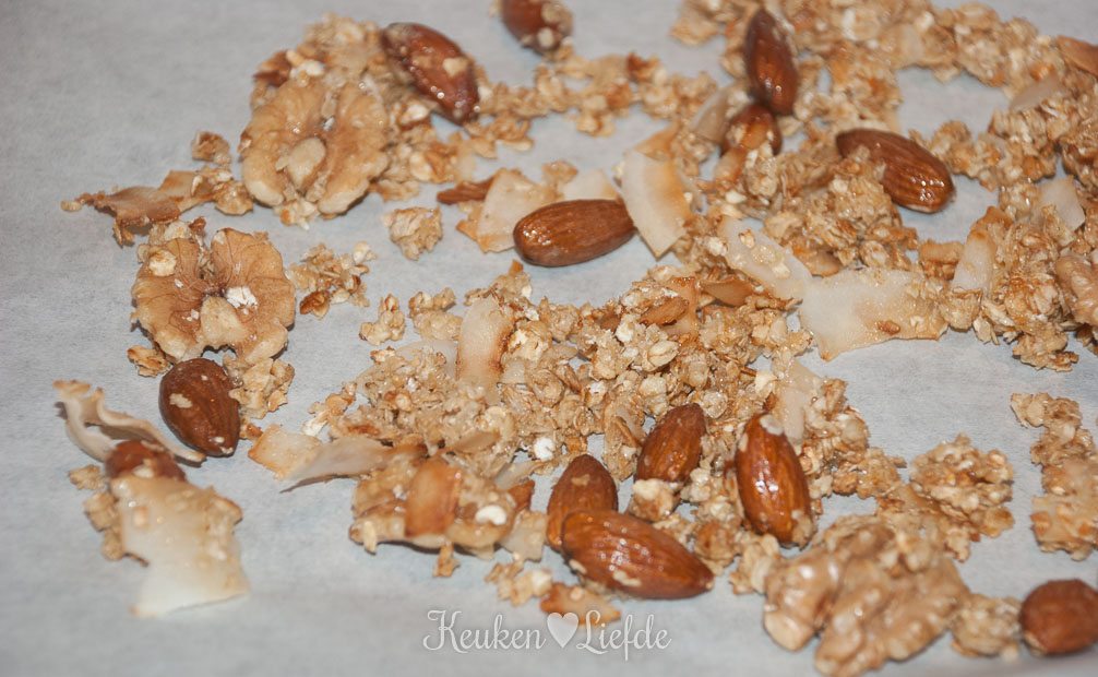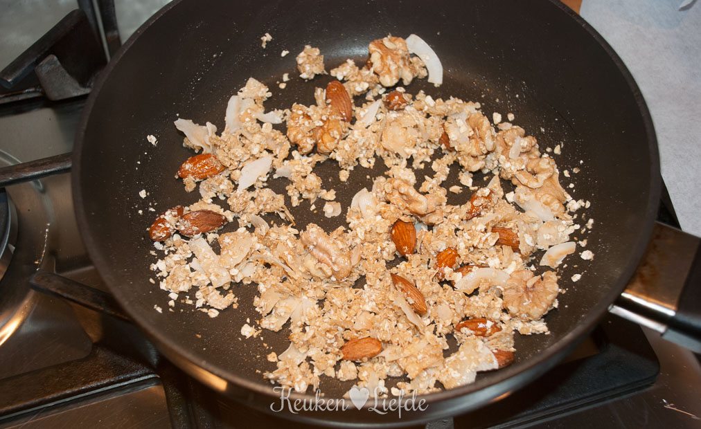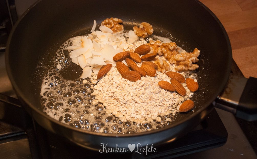 Verhit een koekenpan met de honing en voeg de havervlokken, amandelen, walnoten en kokos toe. Verwarm op laag vuur al roerend, totdat het mengsel licht goudbruin kleurt. Blijf erbij, want als de pan te warm wordt kan het mengsel verbranden! Schep de granola op een bord bekleed met bakpapier en laat afkoelen.