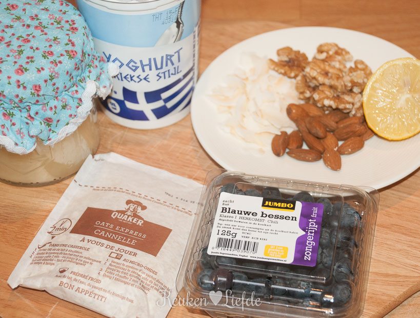 Dit is met afstand het lekkerste ontbijtrecept ooit! Meteen na de eerste hap was ik stapelverliefd. Een doodeenvoudig bordje ontbijtyoghurt verandert als bij toverslag in hemelse verrukking zodra je het verrijkt met zelfgemaakte granola en blauwebessencompote. Van granola (krokant geroosterde havermoutvlokken met noten) kun je nooit genoeg maken: je blijft ervan smullen. Leg dus gerust een grote voorraad aan, want je kunt het prima een aantal dagen bewaren in een luchtdichte trommel. Hetzelfde geldt voor de blauwebessencompote, die niet alleen te gek smaakt over deze yoghurt, maar ook verrast over ijs of door vla.