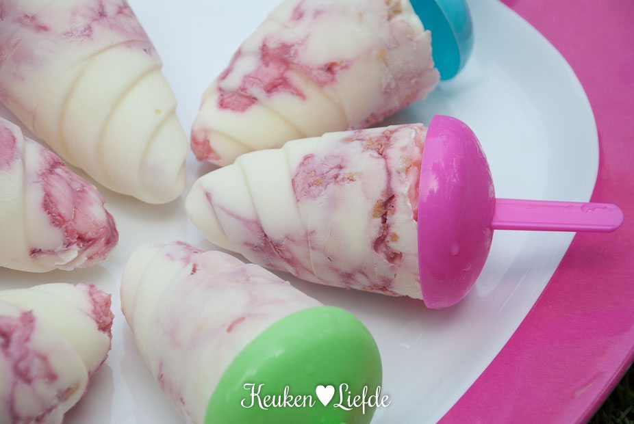 Verkruimel de koekkruimels. Roer de uitgelekte yoghurt los met de suiker en vul de ijslollyvormpjes ermee, niet helemaal vol. Schenk er een scheut grenadinesiroop bij en voeg wat koekkruimels toe en roer dit met een roerstaafje door de yoghurt. Roer niet te lang, zodat je een mooie swirl door de yoghurt krijgt. Eindig met een laagje yoghurt, zodat de vormpjes helemaal gevuld zijn.