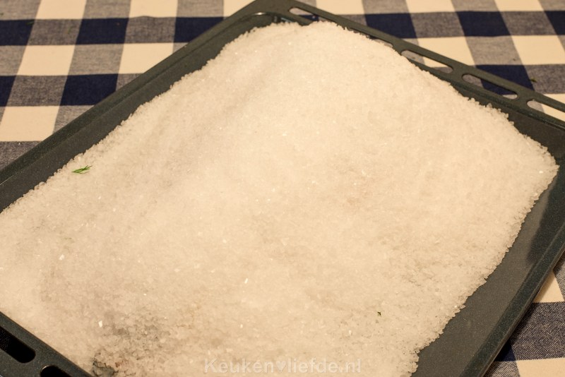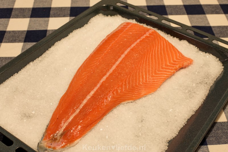 Deze zalm in zoutkorst is bijzonder geschikt om te maken voor een grote groep mensen tijdens een diner. Je kunt de zalm van tevoren al vullen en klaarzetten en op het laatste moment alleen nog maar in de oven te schuiven.