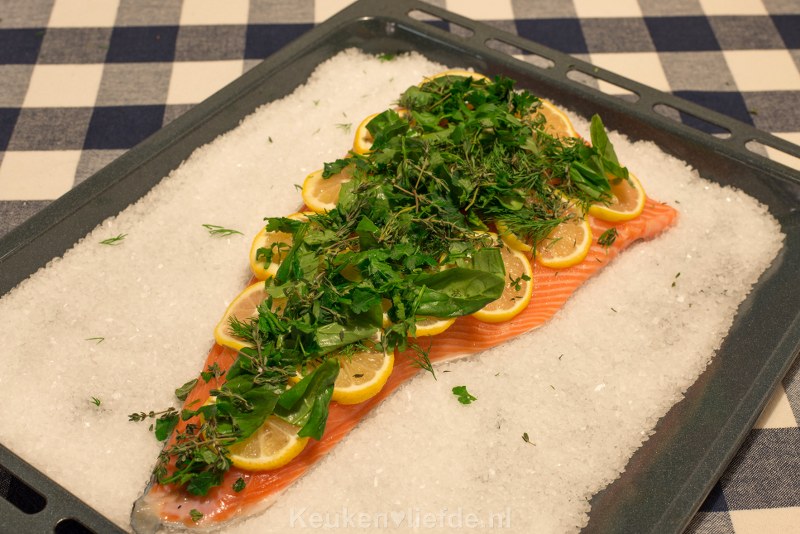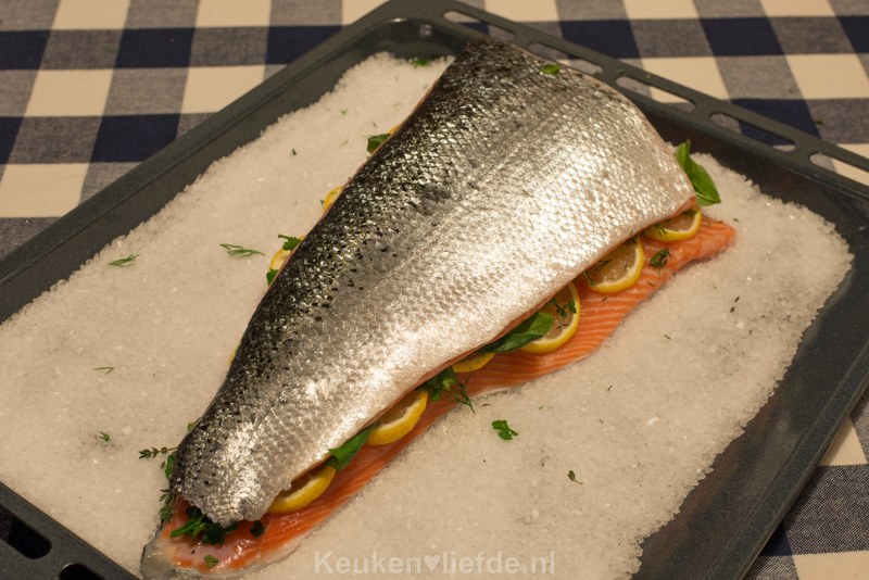Bekleed een bakblik met een laag zout en leg een zalmzijde (velkant naar beneden) op het zout. Beleg met de kruiden en plakjes citroen en leg het andere stuk zalm erbovenop. Bedek de vis helemaal met het overige zeezout.