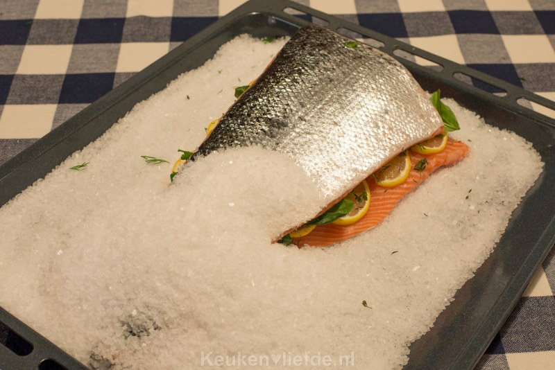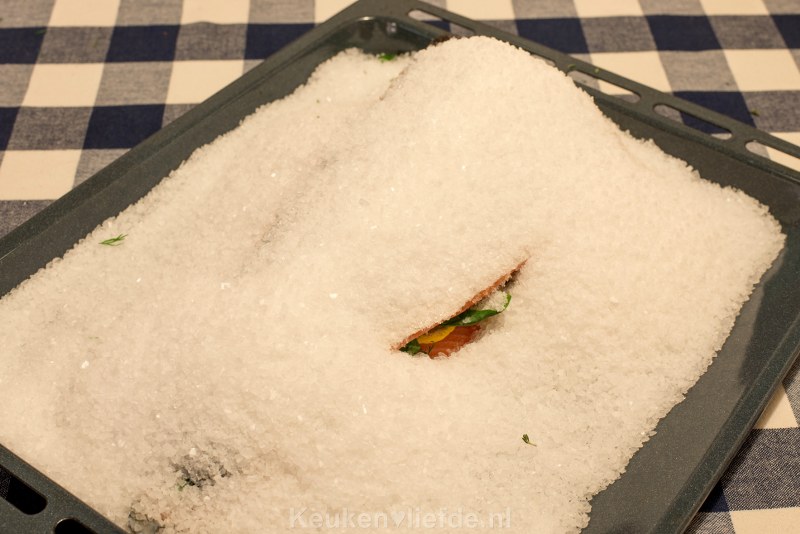 Hoewel dit gerecht er spectaculair uitziet, is het beslist niet moeilijk om te maken. Integendeel zelfs! Grote stukken zalmfilet worden gevuld met citroen en verse kruiden en vervolgens royaal bedekt met een mengsel van zeezout en eiwit, dat tijdens het bakken een hard deeg om de zalm heen vormt. Deze harde korst geeft geen zoute smaak af aan de zalm, maar zorgt er wel voor dat de zalm niet kan uitdrogen en ongelofelijk sappig blijft!
