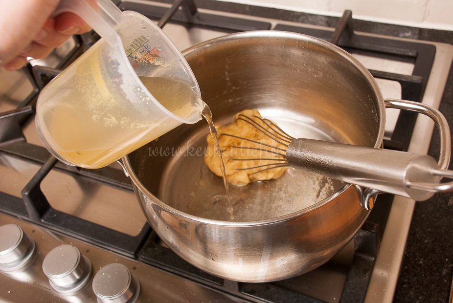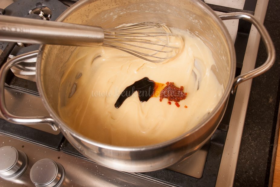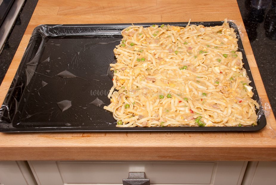 Smelt voor de vulling de boter in een pan — laat de boter niet kleuren. Voeg de bloem toe en roer met een garde goed door. Laat de bloem circa een minuut op laag vuur zachtjes garen — wederom niet laten kleuren. Voeg al roerend met een garde de kippenbouillon toe en zet het vuur iets hoger. Blijf roeren, totdat alle klontjes verdwenen zijn en je een dik gebonden, gladde saus hebt. Breng op smaak met de ketjap en sambal. Roer de bami door de saus en meng goed door elkaar. Verdeel de bami over het bakblik en druk stevig aan. Dek af met vershoudfolie en laat afkoelen. Zet de afgekoelde bami een nacht in de koelkast om op te stijven.