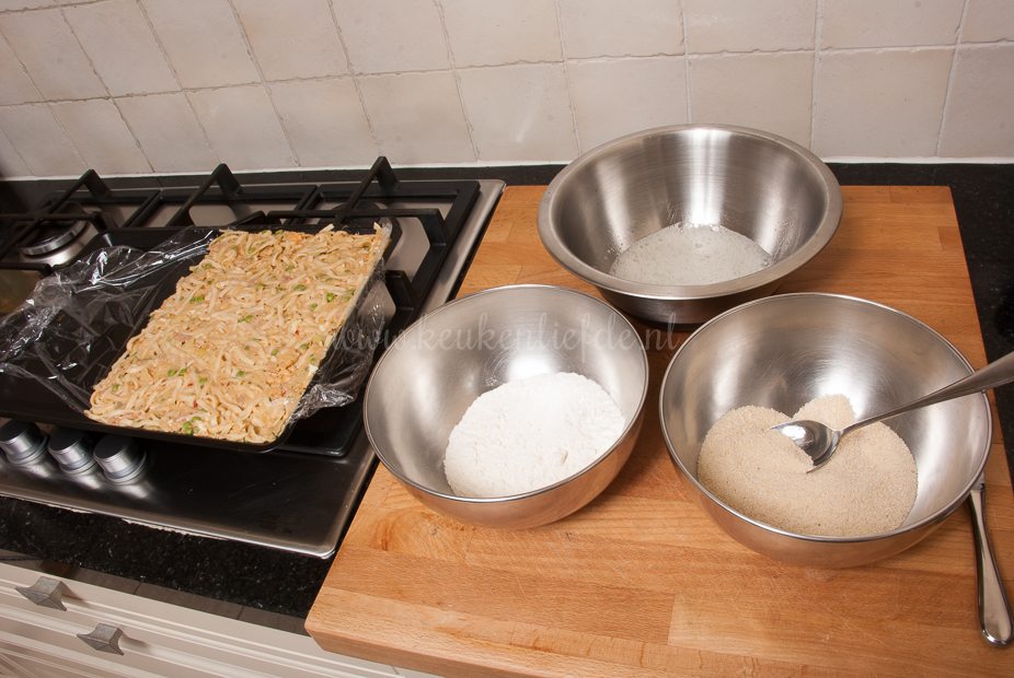 Maar het maken ervan stelde ik steeds uit, omdat ik er een beetje tegenop zag. Maar doordat de bami nu al klaar was, viel het gelukkig reuze mee. Bamivulling maken is echt zo gepiept en daarna laat je haar gewoon een nachtje opstijven in de koelkast. De volgende dag hoef je alleen nog te paneren – daarvoor geef ik je een paar handige tips zodat ook dat een fluitje van een cent wordt.