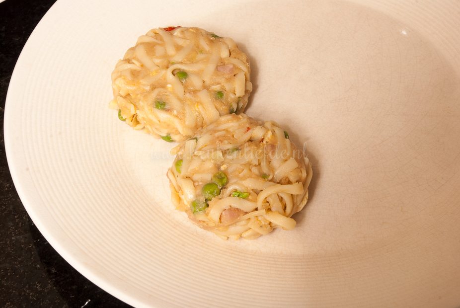 Snijd de bami in 9 gelijke stukken en draai er met je handen stevige, ronde ballen van. Druk ze plat in de vorm van een ronde schijf. Leg de bamischijven op een bord en zet enkele minuten in de vriezer om op te stijven — zo kun je ze straks makkelijker paneren.
