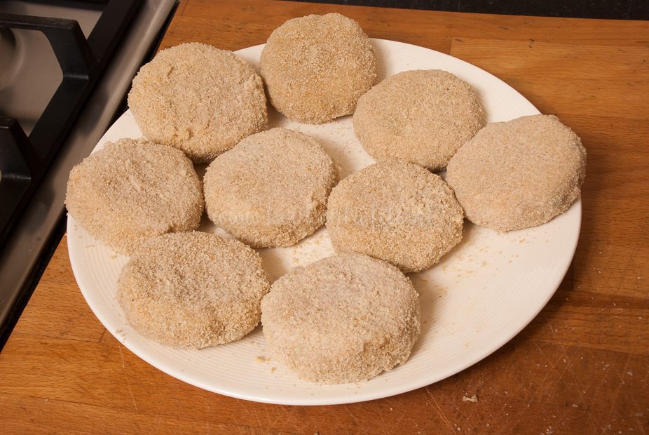 Herhaal dit totdat alle bamischijven gepaneerd zijn. Zet de bamischijven opnieuw in de vriezer (circa 15 minuten) om op te stijven. Paneer de bamischijven voor de tweede keer — het wentelen door de bloem mag je nu overslaan.