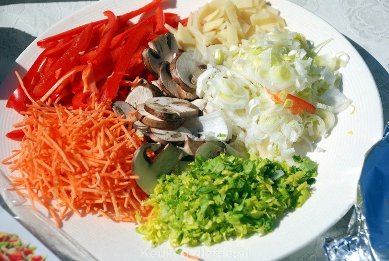 - 1/2 prei (alleen het witte gedeelte), goed gewassen en gedroogd en in smalle ringen gesneden