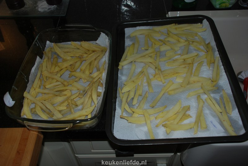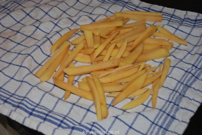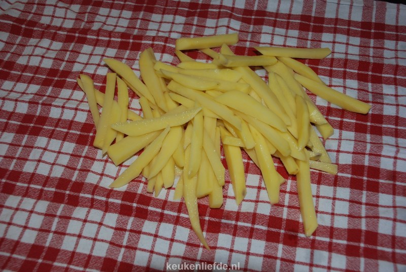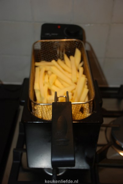 De frietjes worden eerst voorgebakken in ossewit en later afgebakken in de arachideolie. Het bakken in ossewit geeft de heerlijke smaak aan je friet en afbakken in arachideolie (die beter bestand is tegen hoge temperaturen) zorgt ervoor dat je frietjes knapperig worden. Je hebt voor dit recept dus 2 frituurpannen nodig. Natuurlijk kun je de friet ook voorbakken in dezelfde olie als waar je later ook de friet in afbakt maar het voorbakken in ossewit geeft zoveel smaak aan je friet dat de aanschaf van een extra frituurpan meer dan de moeite waard is.