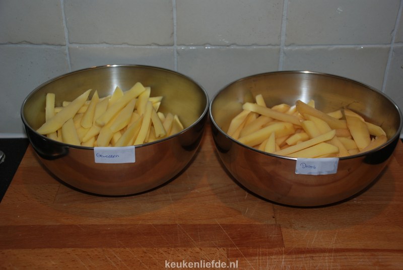Er zijn verschillende theorieën over het wel of niet vooraf wassen van de aardappels. De een zegt dat je de frieten voor het bakken meerdere malen goed moet wassen om het zetmeel eraf te spoelen terwijl een ander beweert dat dit helemaal niet nodig is voor een knapperig resultaat. Wij besloten de proef op de som te nemen en beide manieren te proberen.