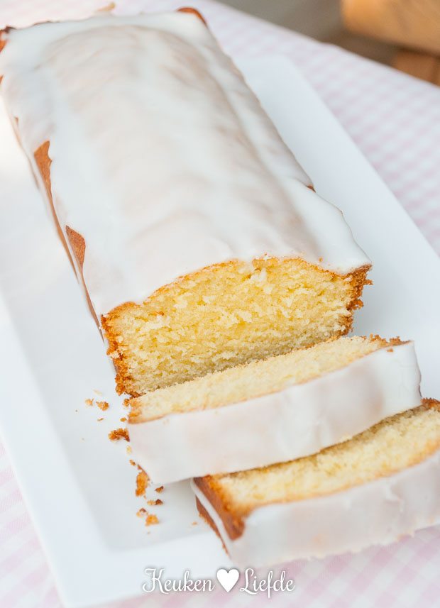 Bak circa 55 minuten in de oven. Laat 15 minuten in de vorm afkoelen en stort de cake op een rooster. Laat de cake op het rooster volledig afkoelen. Pers de andere helft van de citroen uit en roer door de poedersuiker, totdat de poedersuiker volledig is opgelost. Verdun het glazuur met een paar eetlepels melk, totdat je een dik, vloeibaar glazuur hebt. Giet dit over de cake en laat het glazuur hard worden.