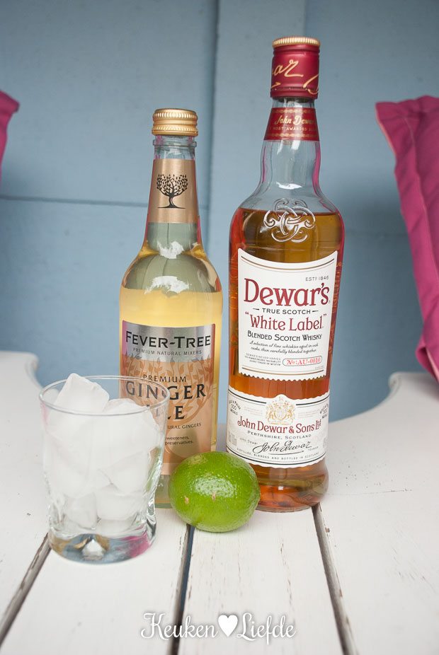 Vul een tumblerglas met ijsblokjes, giet daarover Dewar’s en de premium ginger ale. Knijp wat sap uit de limoenschijfjes over de mix en drop de schijfjes in het glas. Eventueel voorzichtig omroeren.