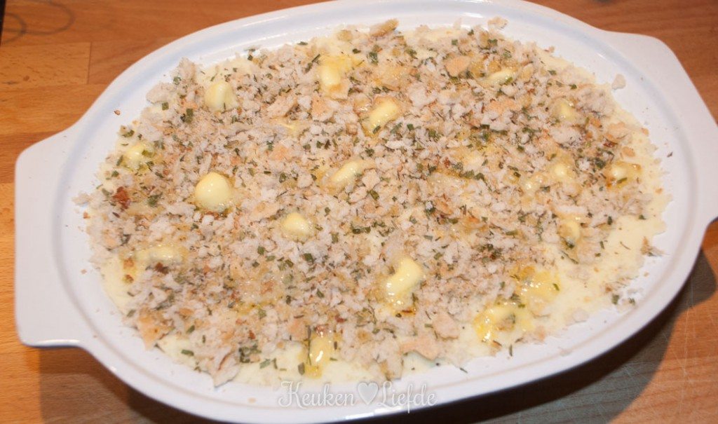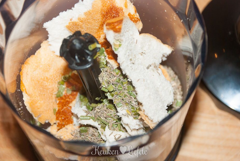 *Droog een paar sneetjes brood in de oven op 80 tot 100 graden, totdat ze droog aanvoelen. Laat ze afkoelen en maal fijn (voeg eventueel wat kruiden toe) in de keukenmachine.